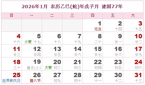 日历表2026 www.1rlb.com 2026年日历及日历表打印版下载