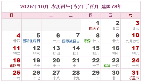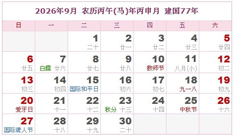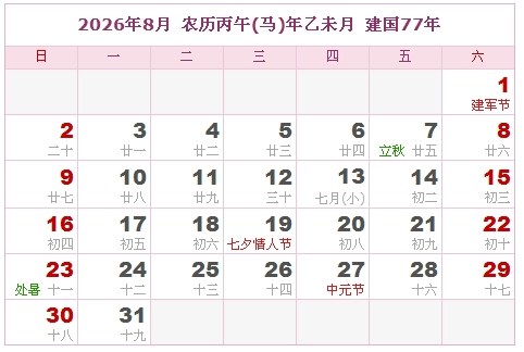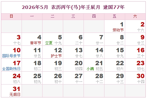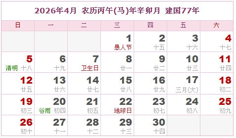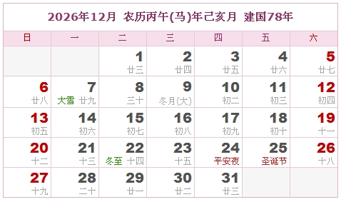 建国77年 公历农历对照表 农历丙午年 【马年】